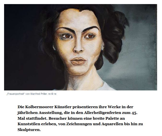 Zum 45. Mal findet in den Allerheiligenferien wieder die Jahresausstellung der Kolbermoorer Künstler statt. Der besondere Vorzug dieser lockeren Künstlervereinigung ist ihre Vielseitigkeit. Das Spektrum reicht von Zeichnungen und Aquarellen über Acryl- und Ölbilder bis zu Skulpturen und Objekten, von realistischer, kubistischer und surrealistischer Interpretation bis zu abstrakter und gegenstandsloser Darstellung. Manche Werke wirken harmonisch ausgeglichen, dekorativ, andere provozieren, prangern Missstände an, sind verrätselt und fordern die Phantasie der Betrachter.