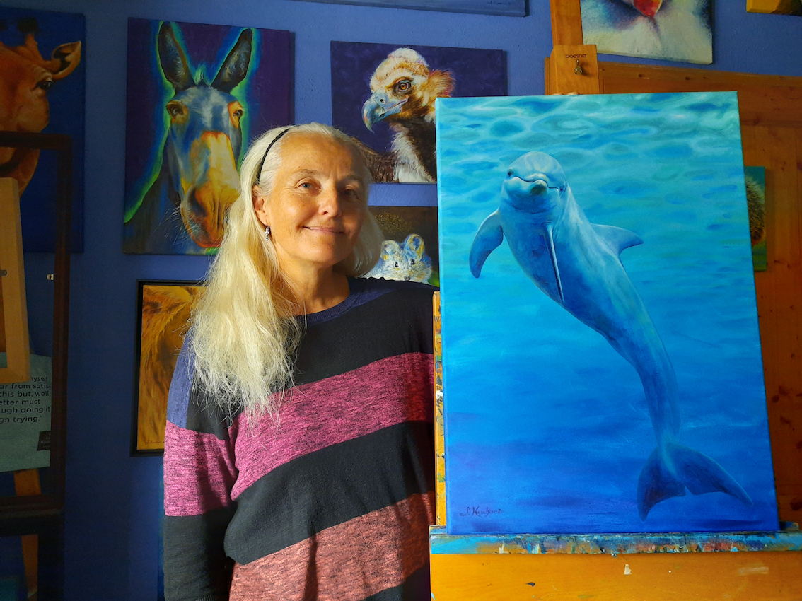 „Aber wenn ich was für mich male, hab‘ ich das Bild vorab im Kopf, es muss dann genauso werden. Aber das ist oftmals ein langer Kampf und Prozess.“ Ihr Stil: realistische Malerei und teilweise Fotorealismus, ihre Motive Tierportraits, ihre Technik Acryl auf Leinwand. Mit ihrer Kunst wolle sie ausdrücken, dass Tiere eine Persönlichkeit haben, betont sie. Ausgestellt hat Sabine Koschier ihre Werke bislang im süddeutschen Raum, auch in Italien, Frankreich, München und Salzburg,